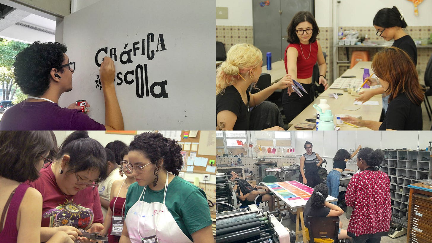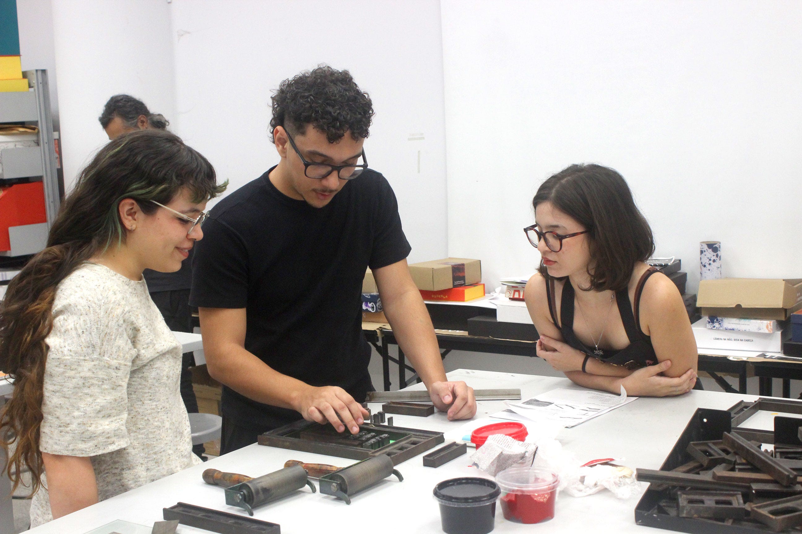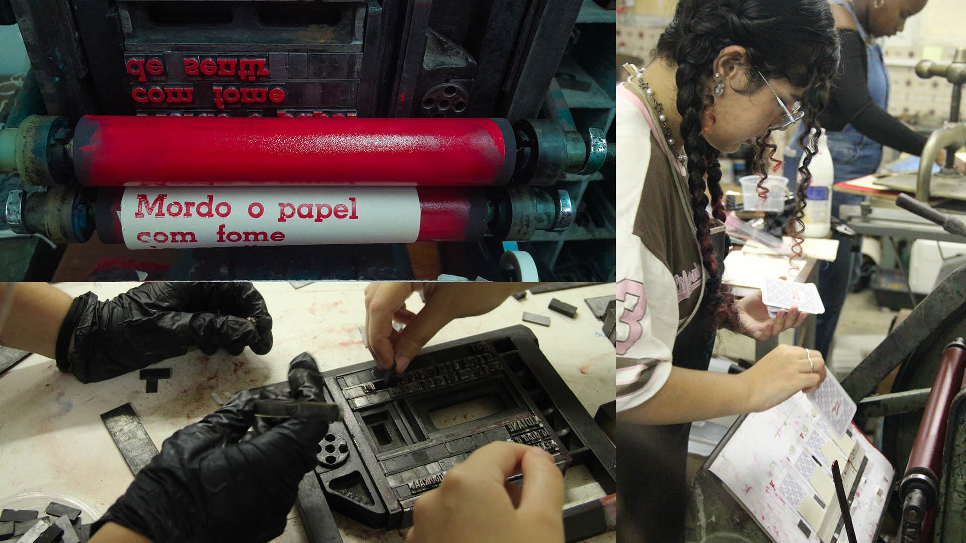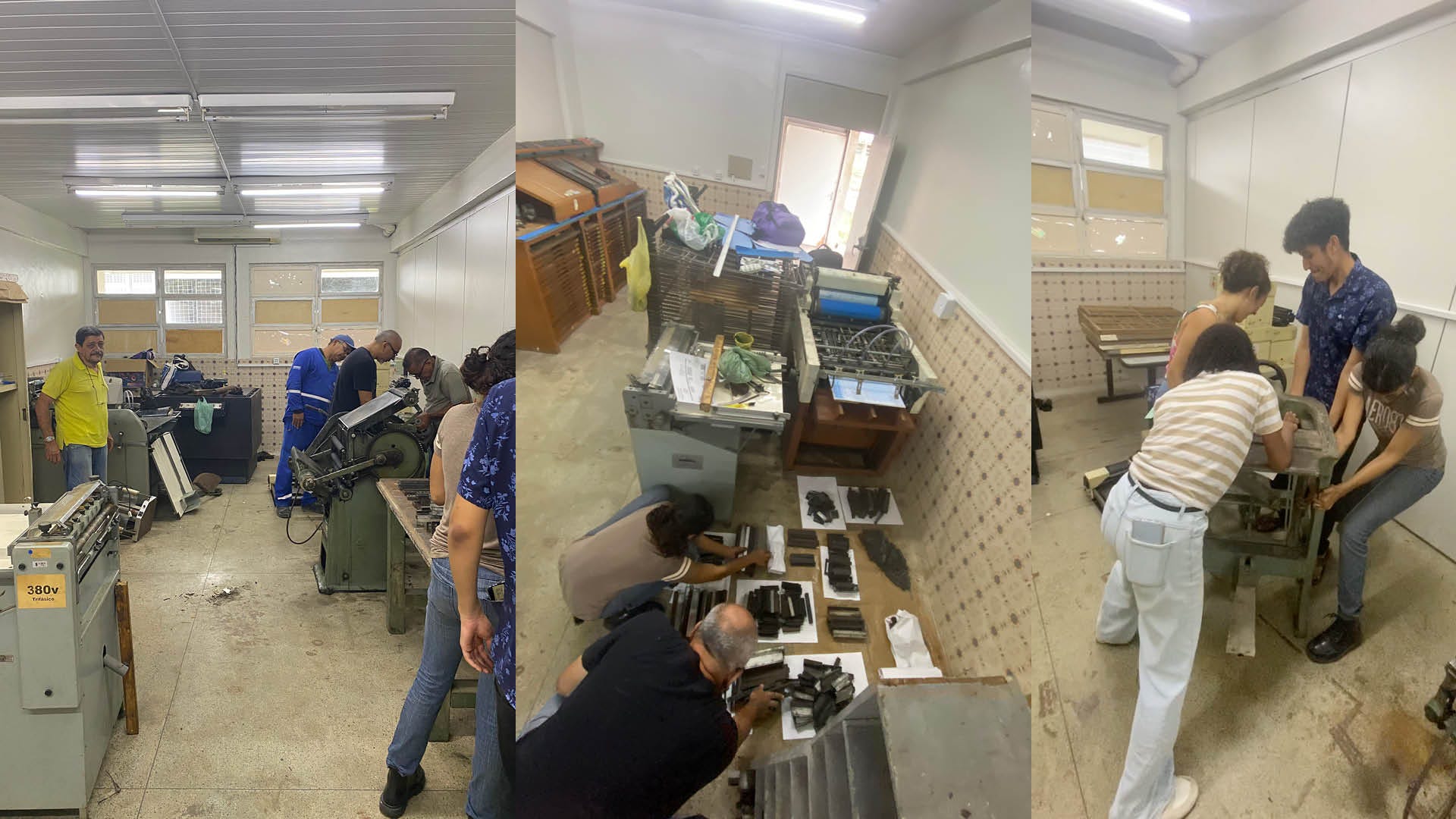 foi esse maquinário abandonado que a gente conseguiu, em alguma medida, resguardar: bem antes de eu me tornar professor aqui, professor josinaldo já havia entocado todo maquinário e mobiliário de tipos móveis. foi só ali por volta de 2019 que conseguimos um espaço para montar um laboratório de impressão para os alunos do primeiro curso de tecnologia em design gráfico do brasil, iniciado em 2000. só que veio a pandemia. em 2022, nós voltamos presencialmente e retomamos os processos para fazer a manutenção do maquinário e, finalmente, no início de 2024, nós abrimos a primeira seleção para o projeto de extensão que nomeamos gráfica-escola.