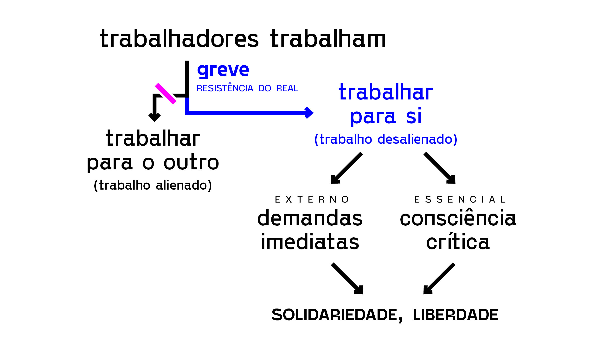 quando iniciávamos os trabalhos da gráfica, ironicamente, veio a greve da educação federal, que se iniciou em abril. então, em greve, a gente paralisaria o trabalho, certo? errado. tal qual na definição do que é a escola, uma leitura específica sobre trabalho se converte em atitudes muito diferentes. a essa altura, eu tinha lido esse livrinho de álvaro vieira pinto, um filósofo brasileiro importantíssimo, intitulado “por que os ricos não fazem greve?”4. para usar isso em algumas apresentações, fiz o esquema a seguir que delineia mais ou menos como vieira pinto explica a relação entre trabalho e greve: